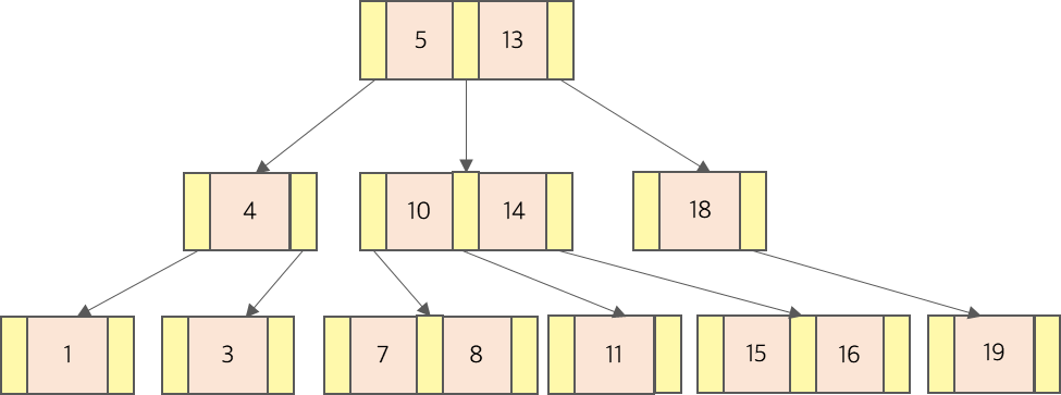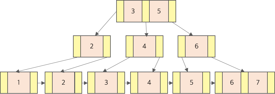 중간에 있는 브랜치 노드, 마지막에 위치한 리프 노드로 구성된다. 노드의 데이터들은 항상 정렬된 상태이다.