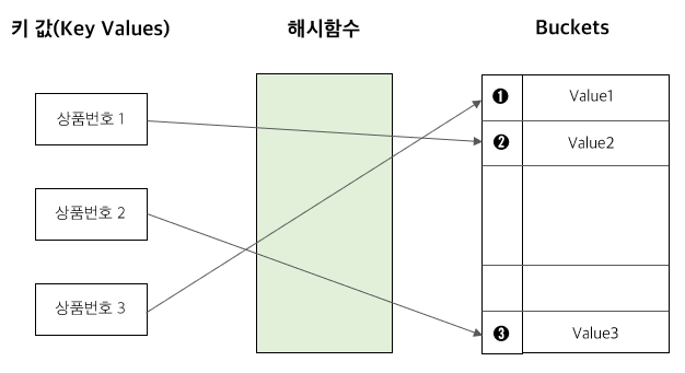해시함수를 통해 해시값 ①이 생성된다. 상품번호2는 해시함수를 통해 해시 값 ②, 상품번호 3은 해시함수를