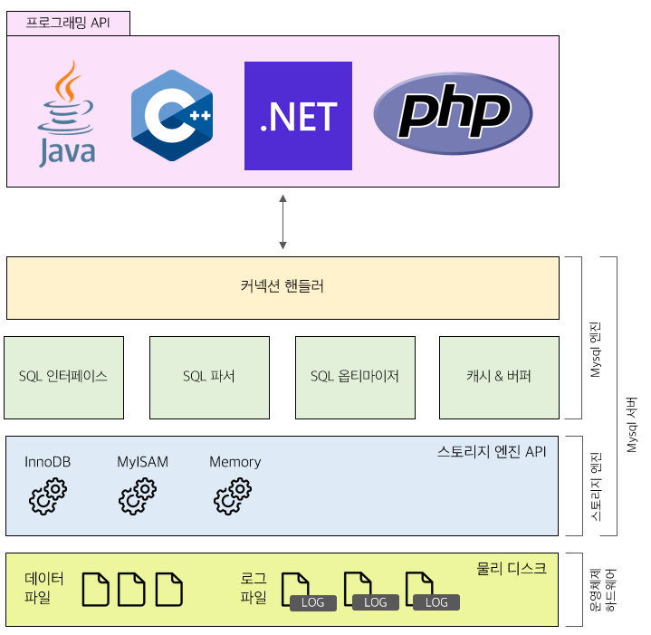 MySQL 엔진은 클라이언트로부터 접속, 쿼리 요청을 처리하는 커넥션 핸들러, SQL 파서 및 전 처리기, 쿼리 최적화 실행을 도와주는 옵티마이저로 구성되어 있다. MySQL 엔진은 요청된 SQL문장을 분석하거나 최적화를 한다.