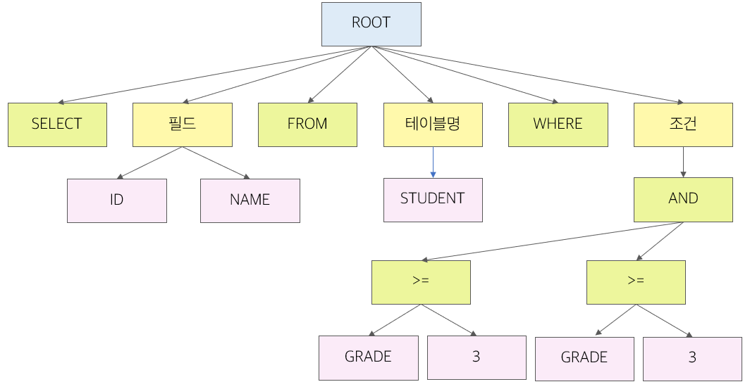 분리해 트리 형태의 구조로 만들어 내는 작업이다. 쿼리 문장의 문법 오류는 쿼리 파서 과정에서