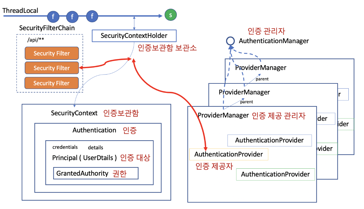 - 인증 필터는 AuthenticationManager 통해 Authentication 인증 후 결과를 인증 결과의 보관소라고 할 수 있는 SecurityContextHolder 에 넣어준다
