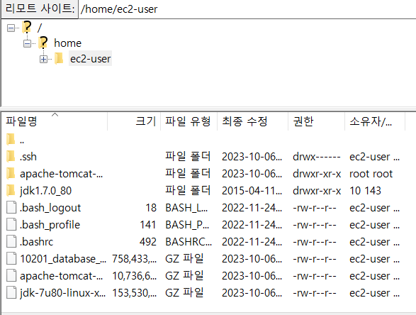 - yum 으로 java 1.7, Apache Tomcat 8.5를 설치할 수 없어 개인적으로 다운받은 후 FileZila를 활용하여 ec2 서버로 전송하였다